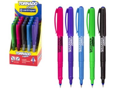 Oblíbené kuličkové pero Tornado s trojúhelníkovou úchopovou částí s masážními body, s tenkou rovnoměrnou stopou šířky 0.3 mm, která se dá vyzmizíkovat, inkoustová náplň modré...